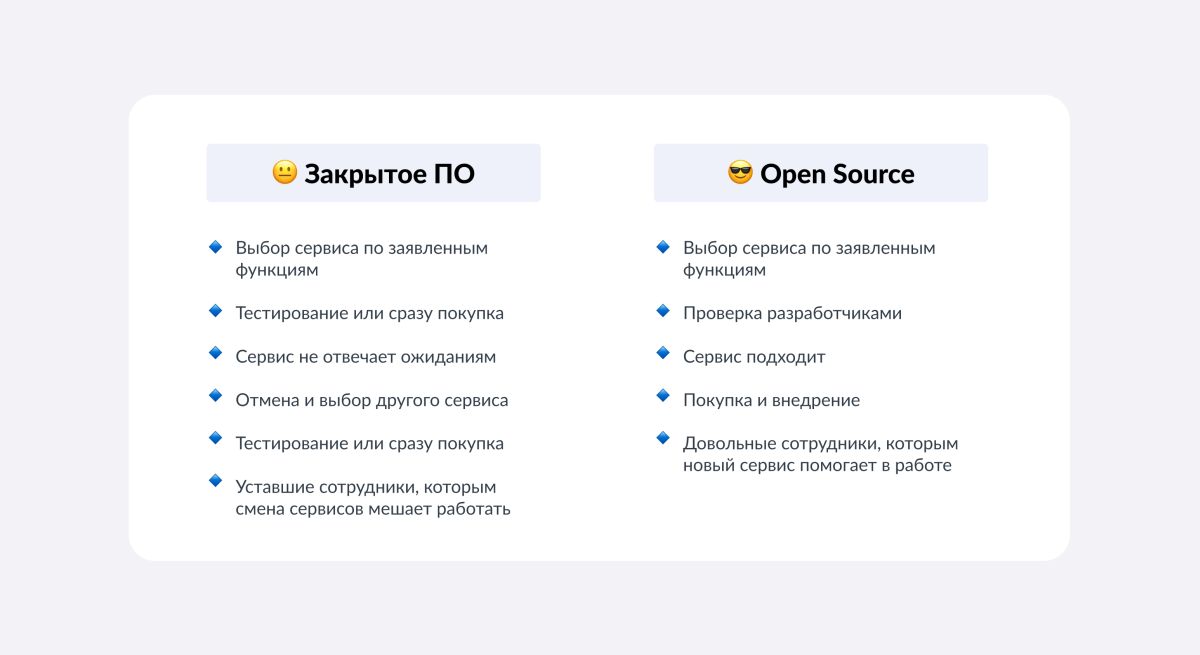 Для разработчиков использование open source — это возможность не «создавать велосипед с нуля». Вместо этого мы берем уже проверенные решения, адаптируем их под свои нужды и вносим улучшения. Такой подход значительно сокращает время разработки, позволяет сократить затраты и повысить качество конечного продукта.