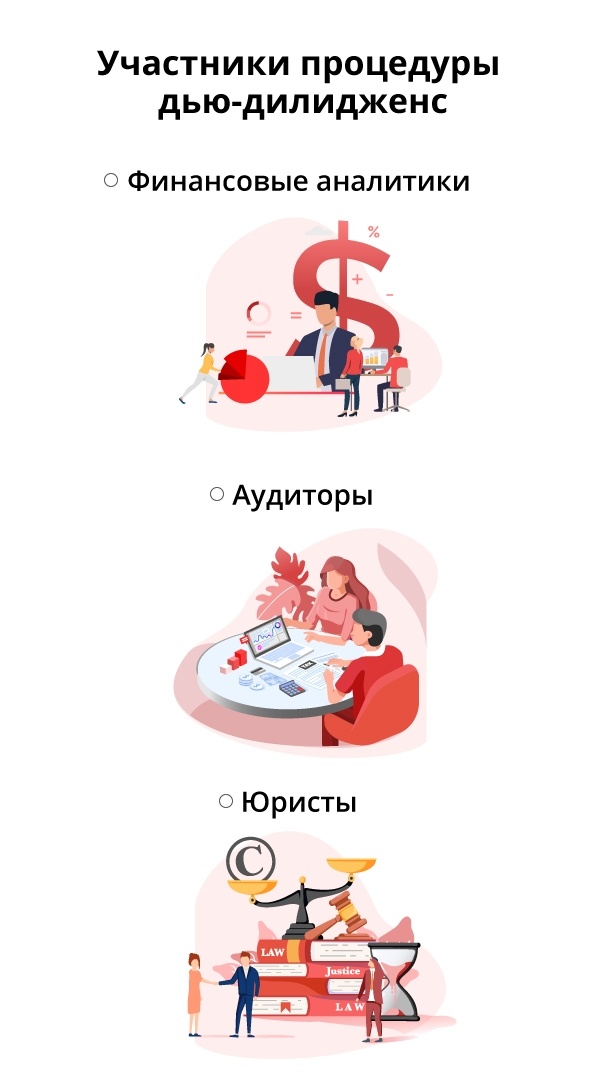 Перед началом работы важно подготовиться. Необходимо сформировать команду специалистов — юристов, бухгалтеров, аналитиков. Также стоит подготовить перечень вопросов и документов, которые нужно запросить у компании-объекта исследования.